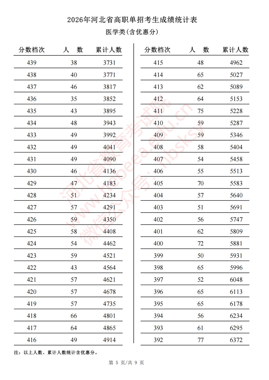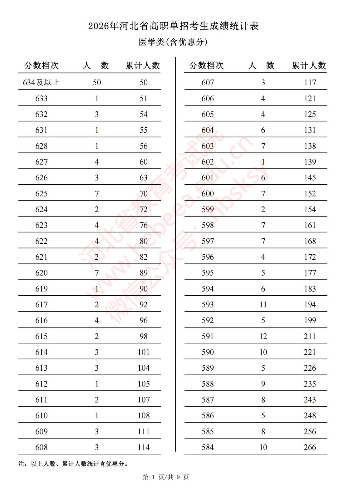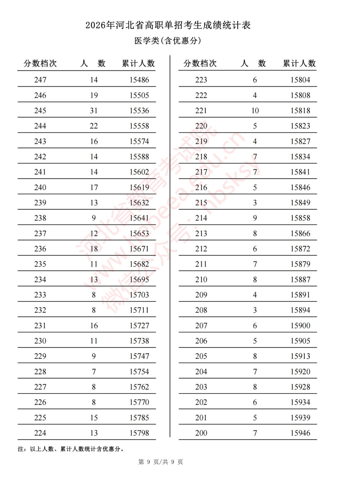 2026年河北省高职单招考生成绩统计表医学类(含优惠分)一分一档表