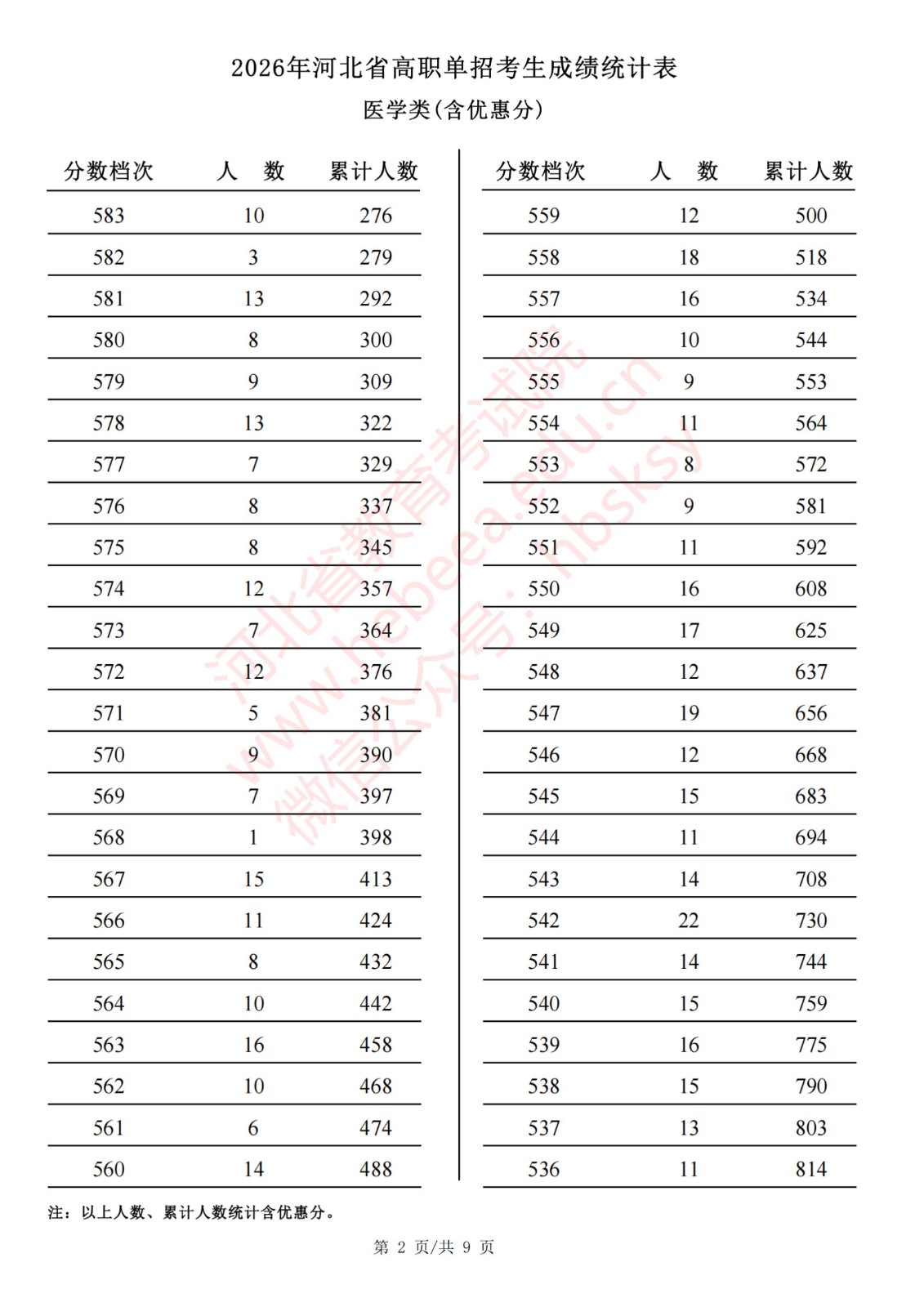 2026年河北省高职单招考生成绩统计表医学类(含优惠分)一分一档表